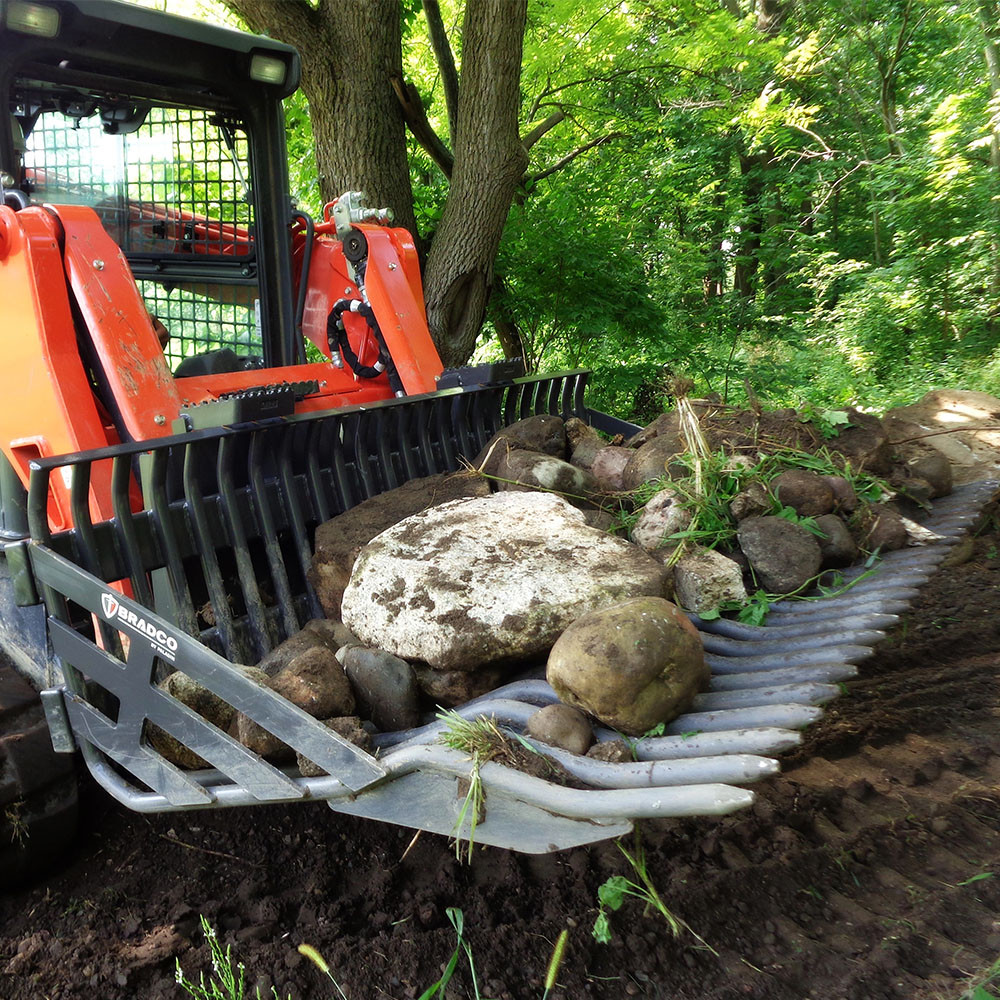 Bradco Skid Steer Rock Buckets feature alloy steel tines that are tough and durable for the most adversarial conditions. These tines have been heat treated and are perfectly straight and strong.  These buckets come in two sifting widths and three overall widths so you can select the bucket that suits your needs.  Skid Steer Solutions is happy to offer one of the finest Rock Sifting Buckets available, with options to suit the needs of all Skid Steer operators. The Bradco Rock Buckets are compatible with all Skid Steer loaders utilizing the modern universal quick attach system.